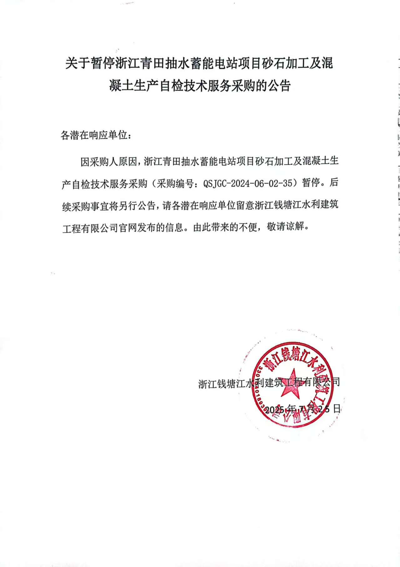 【重要通知】关于暂停浙江青田抽水蓄能电站项目砂石加工及混凝土生产自检技术服务采购的公告