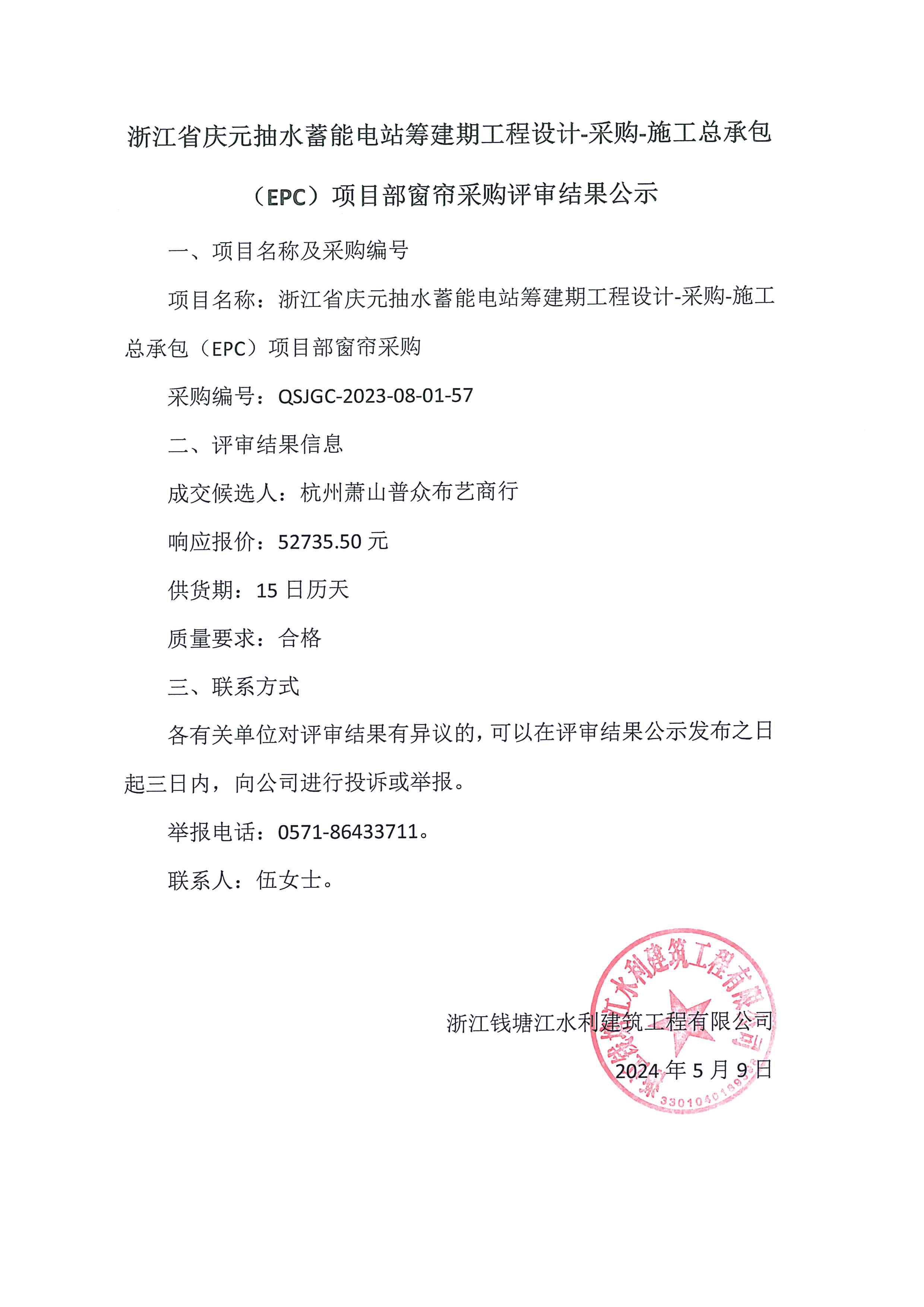 浙江省庆元抽水蓄能电站筹建期糖心vlog 设计-采购-施工总承包(EPC)项目部窗帘采购评审结果公示