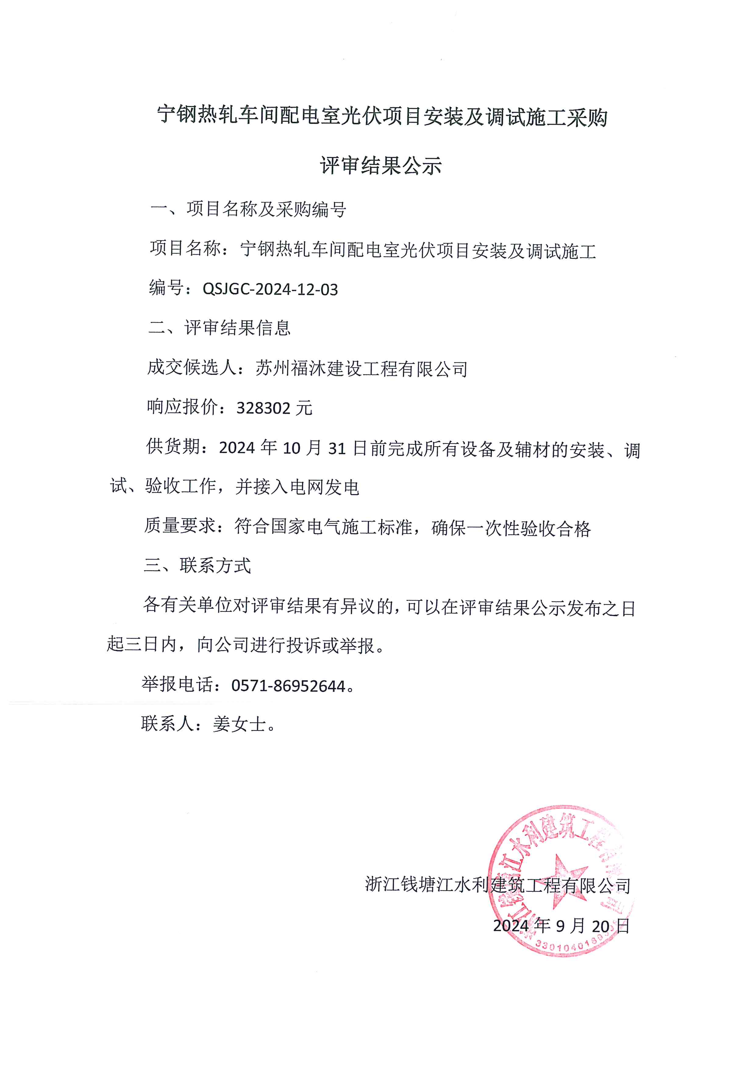 宁钢热轧车间配电室光伏项目安装及调试施工采购评审结果公示