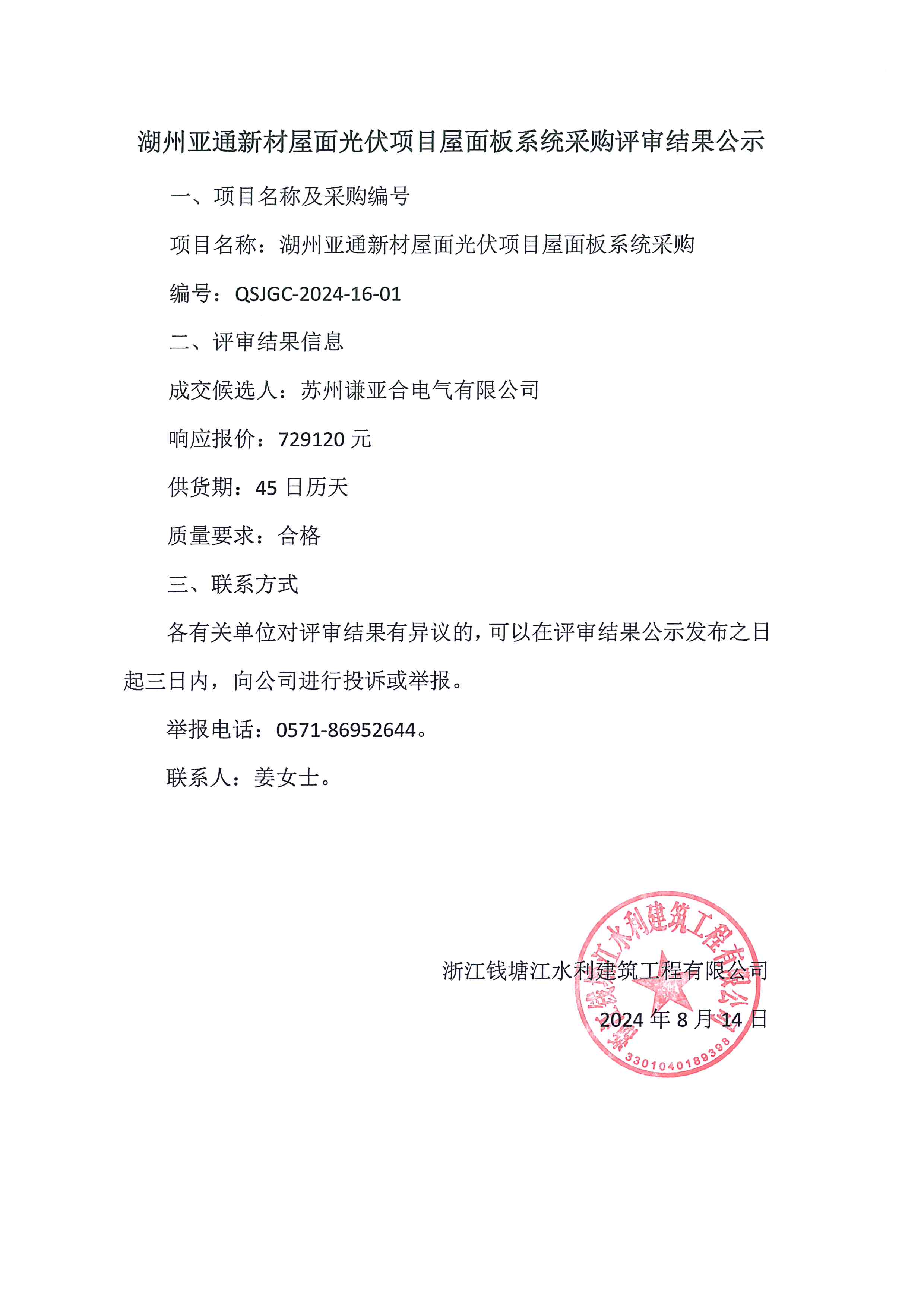 湖州亚通新材屋面光伏项目屋面板系统采购评审结果公示