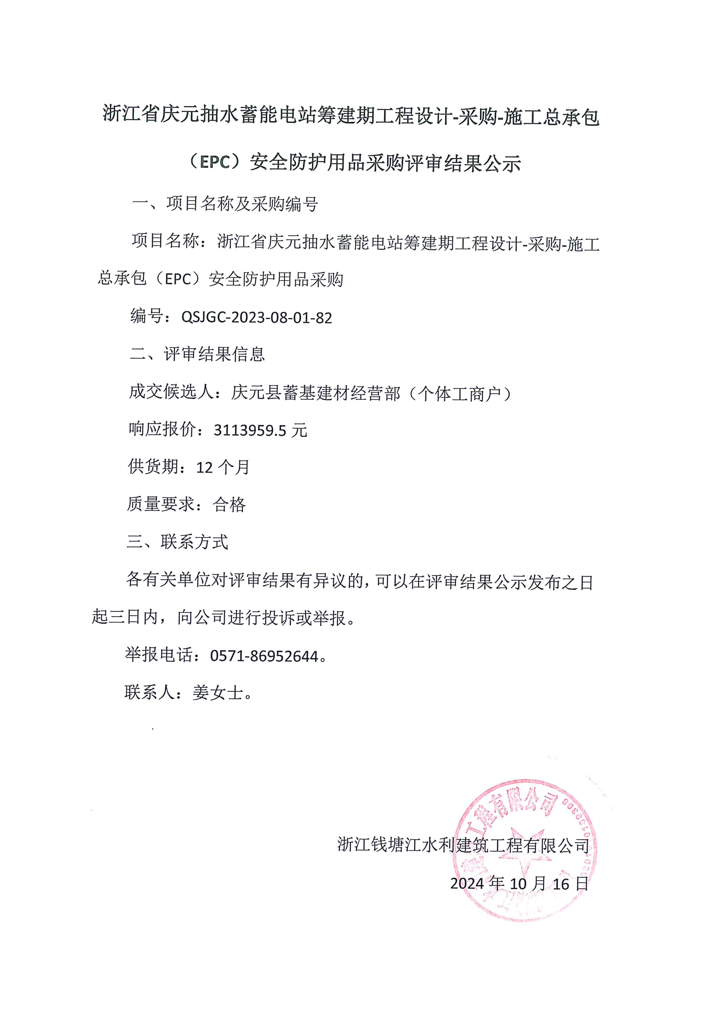 浙江省庆元抽水蓄能电站筹建期糖心vlog 设计-采购-施工总承包(EPC)安全防护用品采购评审结果公示