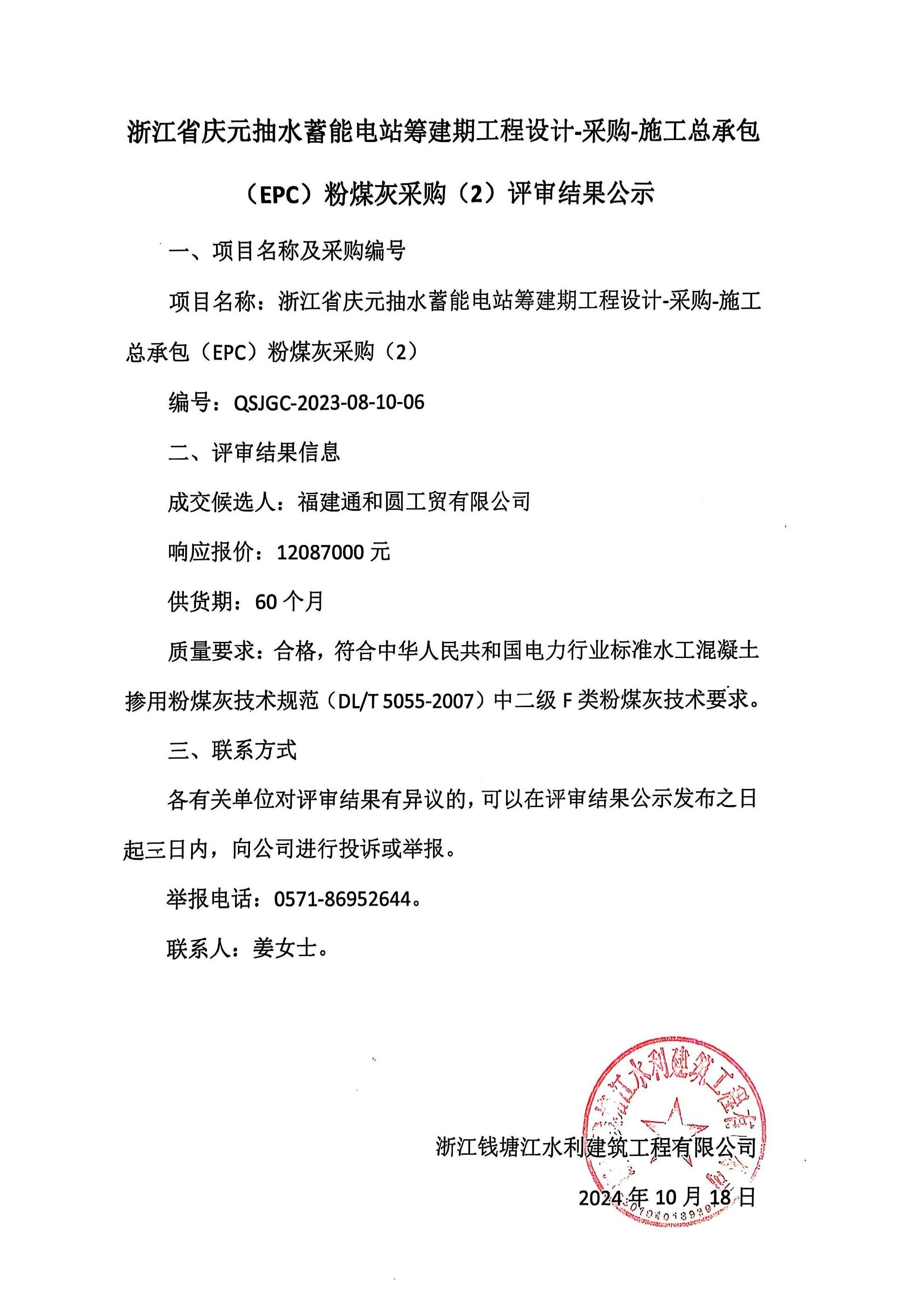 浙江省庆元抽水蓄能电站筹建期糖心vlog 设计-采购-施工总承包(EPC)粉煤灰采购(2)评审结果公示