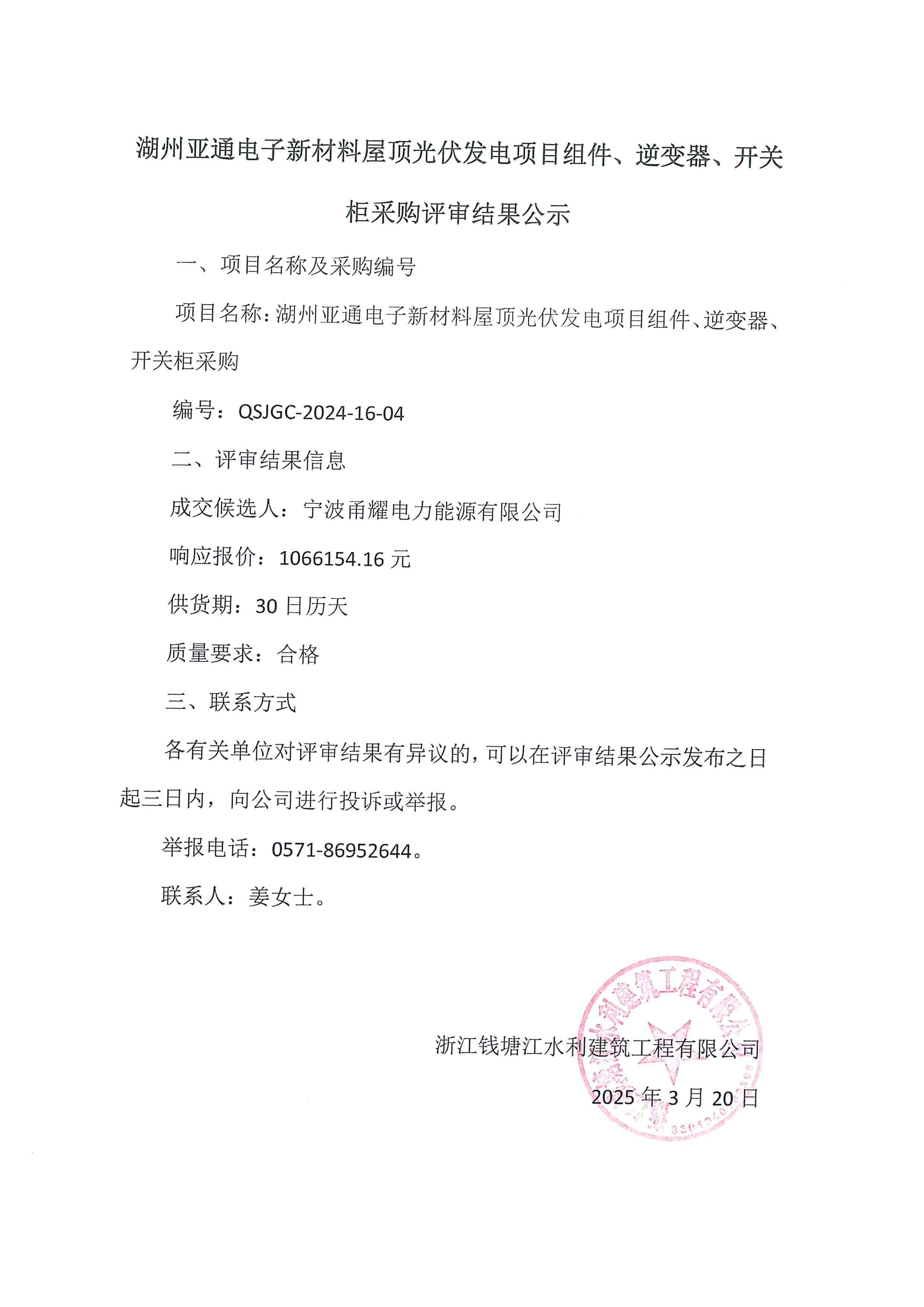 湖州亚通电子新材料屋顶光伏发电项目组件、逆变器、开关柜采购评审结果公示