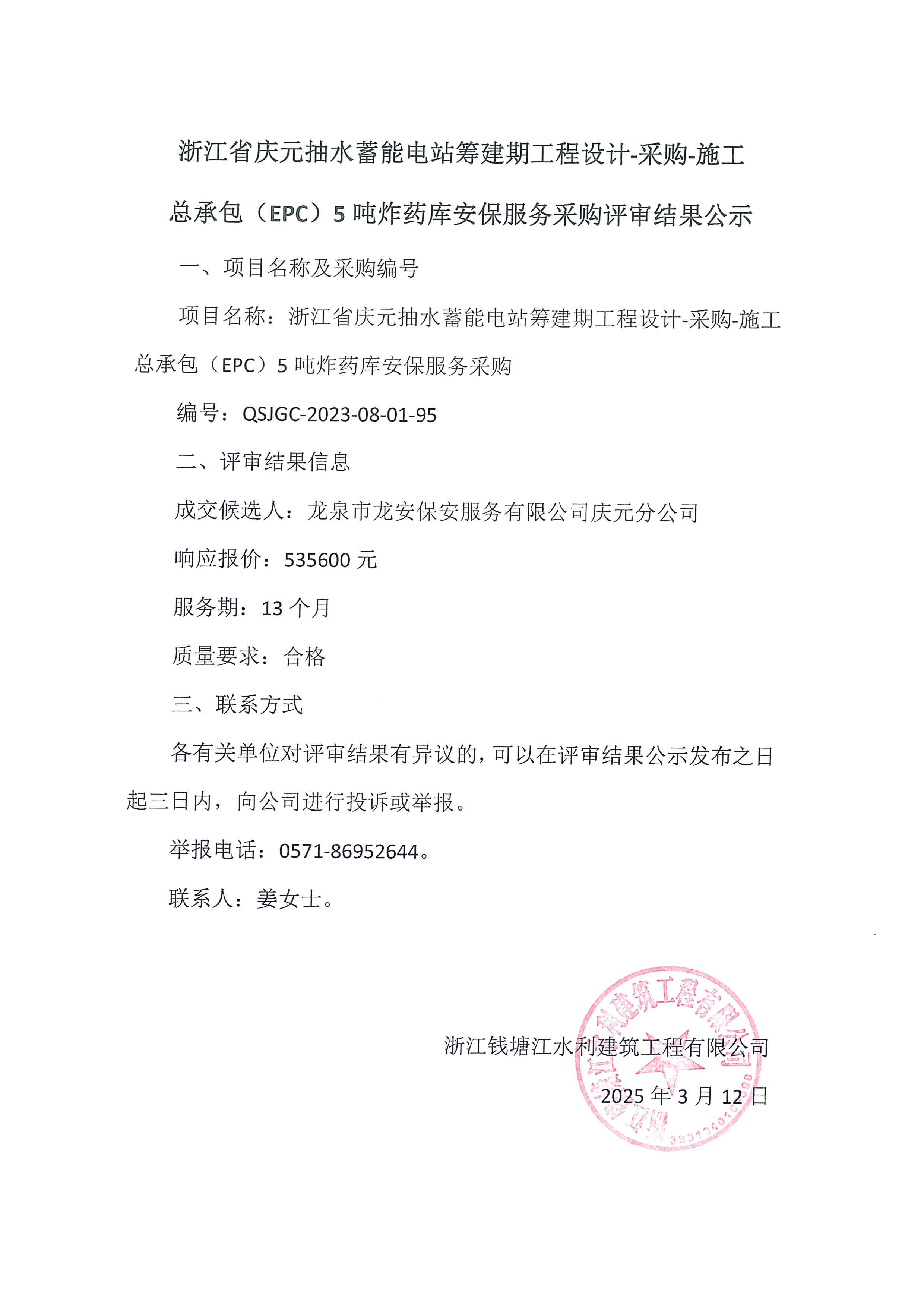 浙江省庆元抽水蓄能电站筹建期糖心vlog 设计-采购-施工总承包(EPC)5吨炸药库安保服务采购评审结果公示