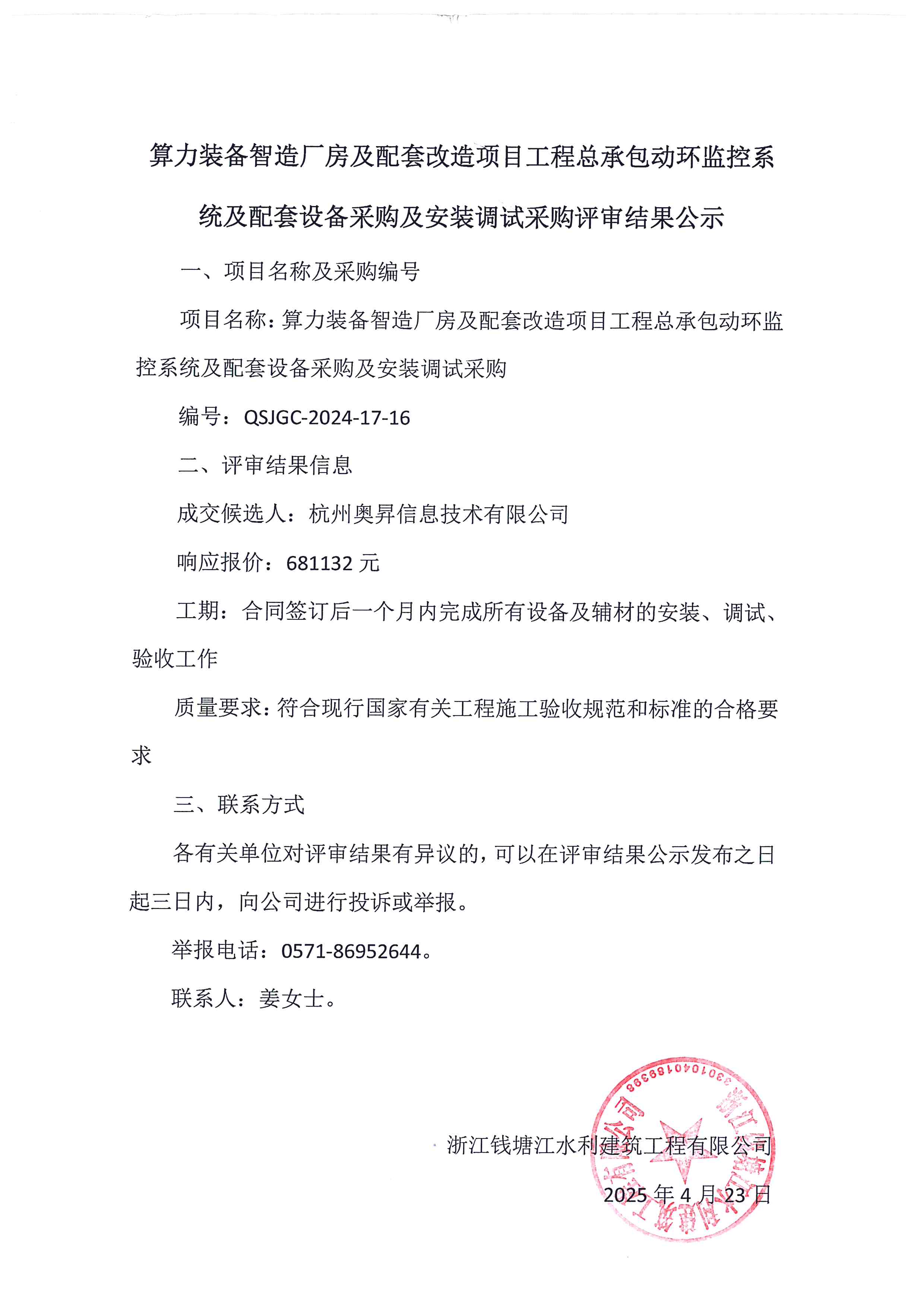 算力装备智造厂房及配套改造项目糖心vlog 总承包动环监控系统及配套设备采购及安装调试采购评审结果公示