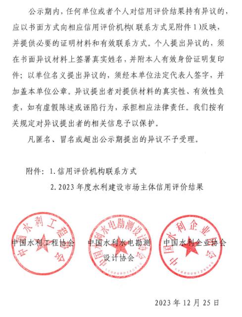 协会发布了《关于2023年度水利建设市场主体信用评价结果的公示》,公司荣获2023年度水利建设市场主体信用最高等级AAA级评价!这是继2020年以来公司第二次获此殊荣,充分彰显了公司在信用管理和综合实力方面的卓越成绩。